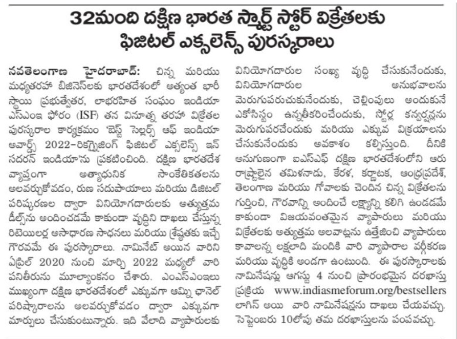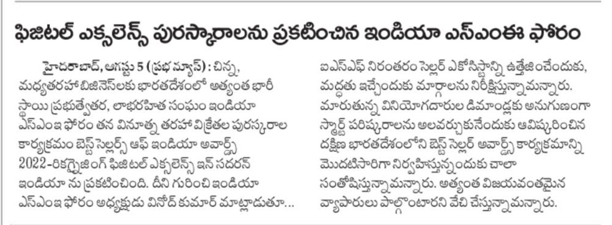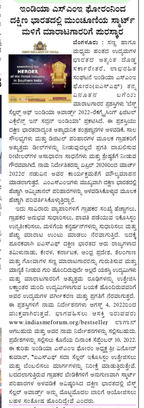 | 06-08-2022 | Nava Bhoomi | India SME Forum to award top smart store sellers in South India | View |