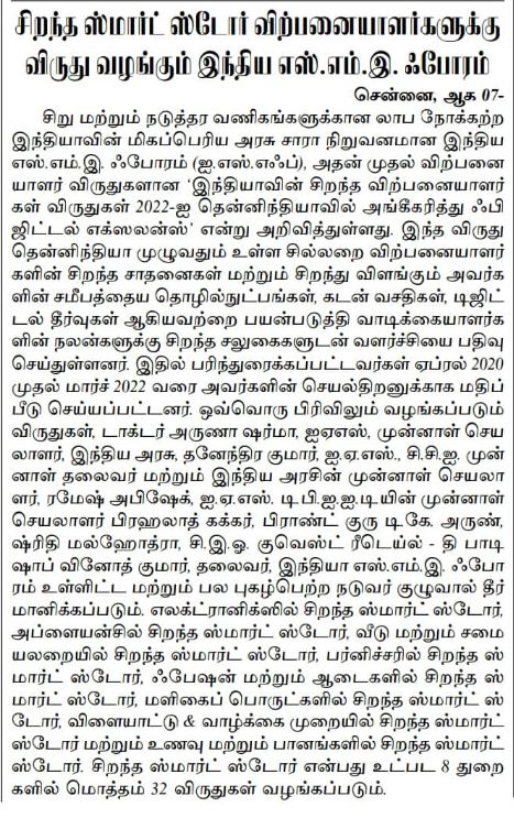 | 08-08-2022 | Tamil Anjal | India SME Forum to award top smart store sellers | View |