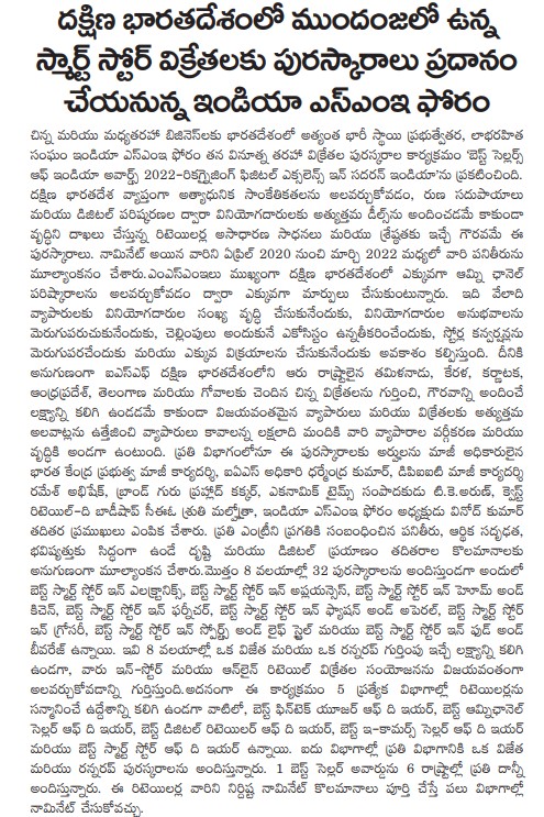 | 07-08-2022 | Janam Sakshi | India SME Forum to award top smart store sellers in South India | View |