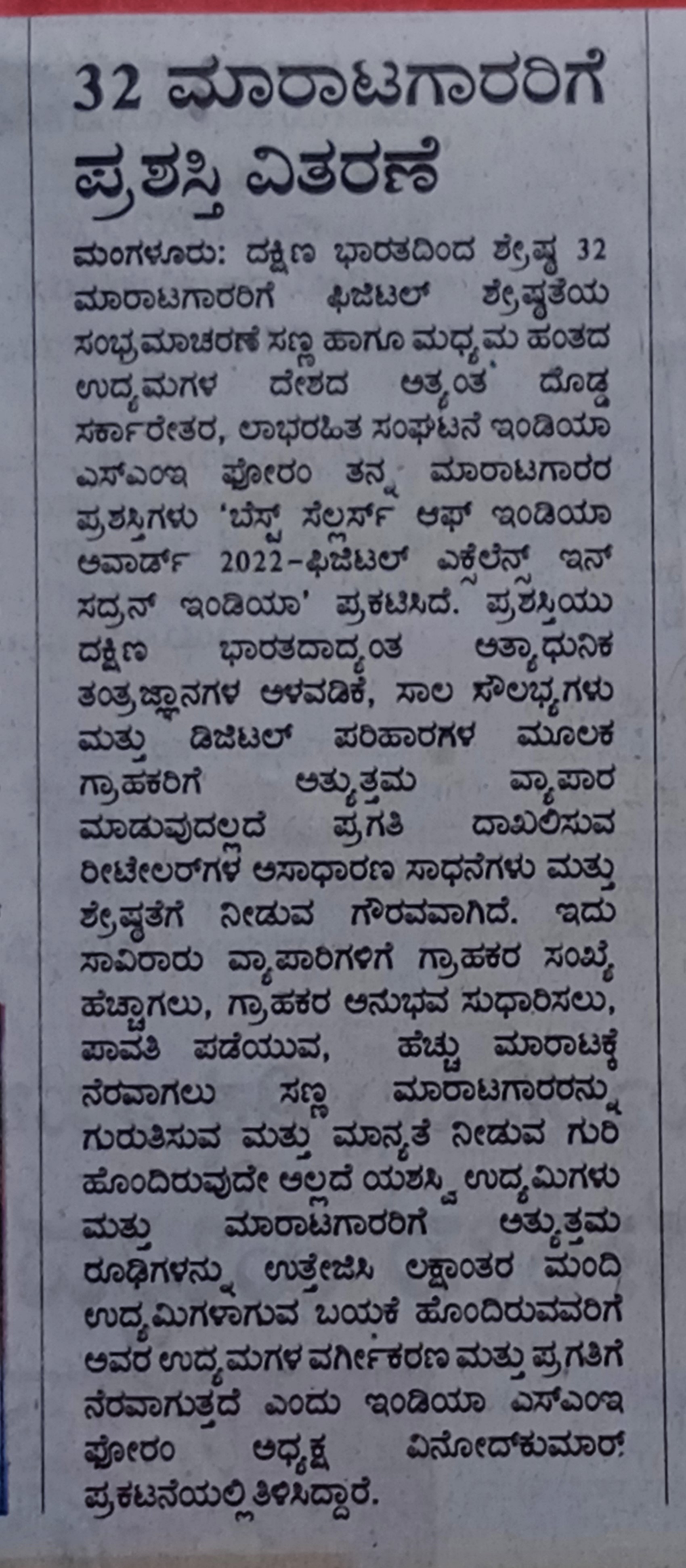 | 18-08-2022 | Samyukta Karnataka | Award top smart store sellers | View |