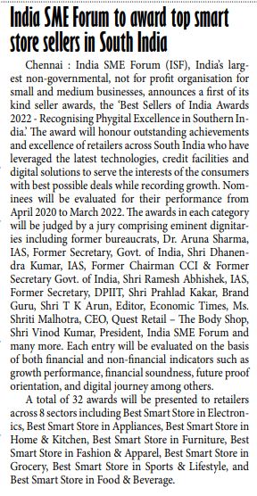 | 07-08-2022 | Southern Mail | India SME Forum to award top smart store sellers in South India | View |
